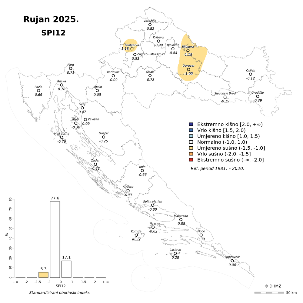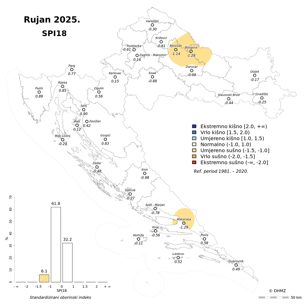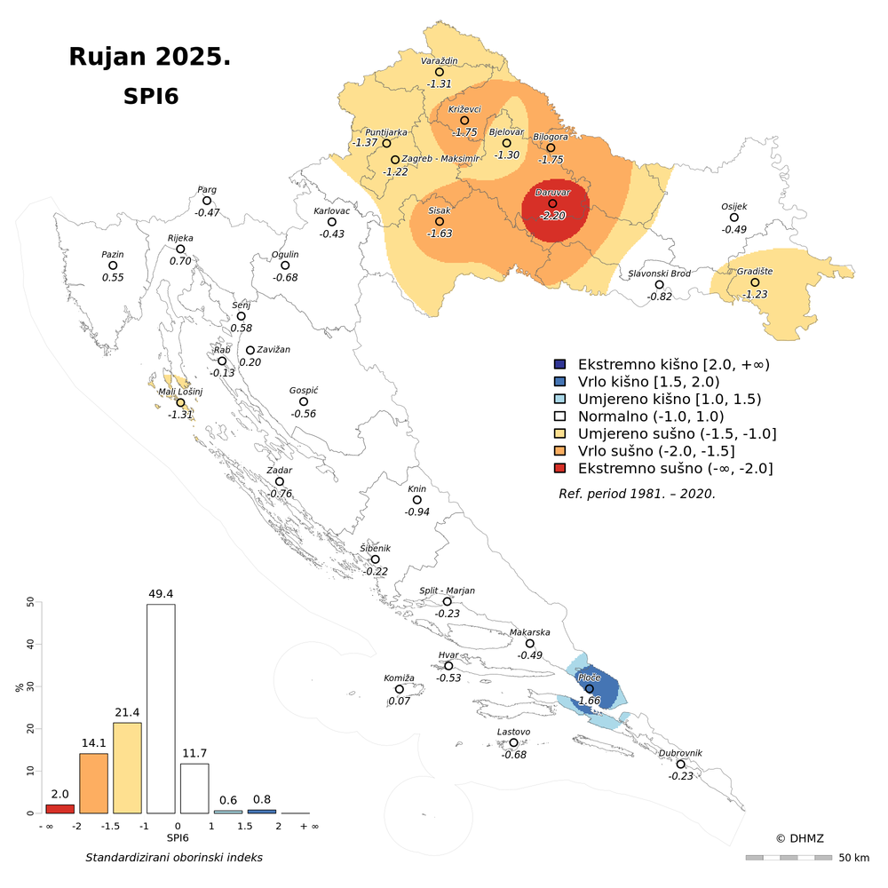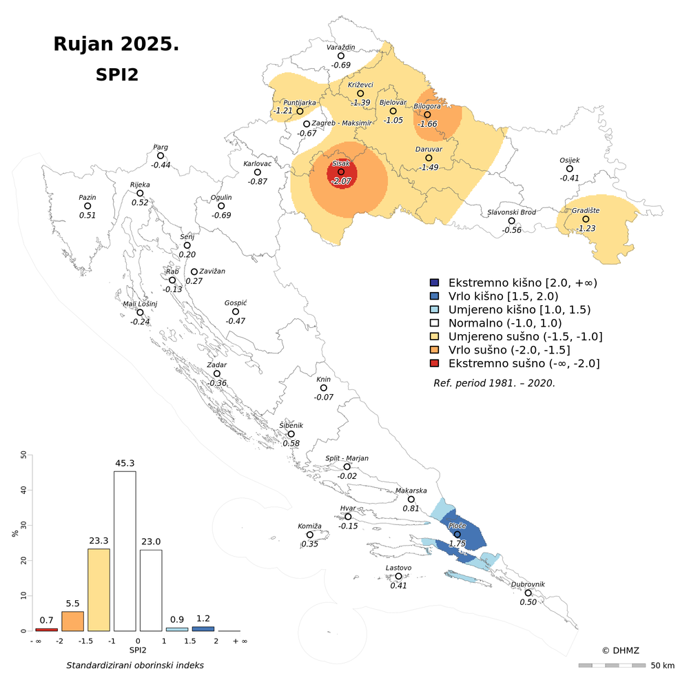 U proteklih dva (kolovoz i rujan), tri (od srpnja do rujna) i šest mjeseci (od travnja do rujna) oborinske prilike bile su slične kao u rujnu, a najveća odstupanja od prosjeka na spomenutim skalama zabilježena su redom u Sisku (ekstremno sušno), u Pločama (ekstremno kišno) i u Daruvaru (ekstremno sušno).