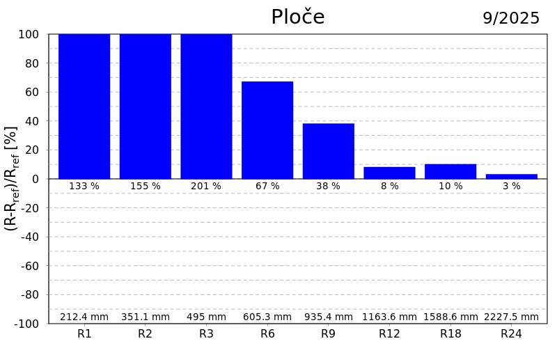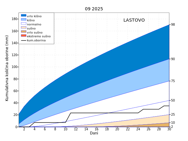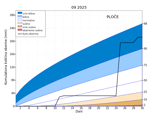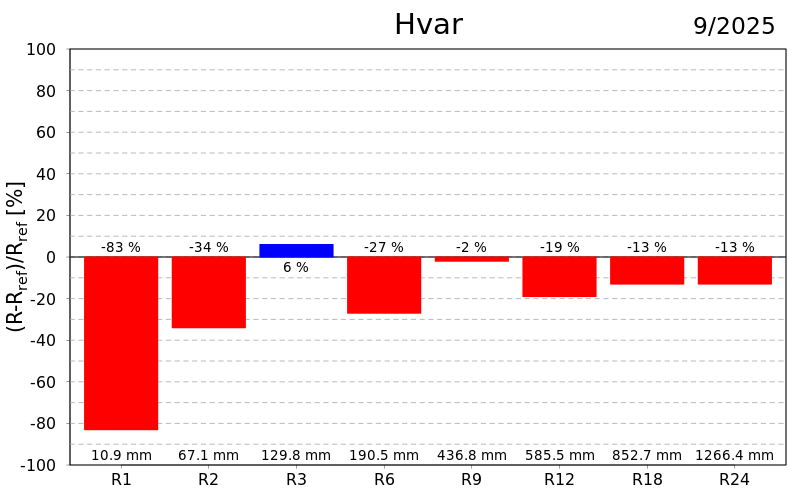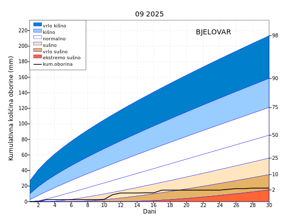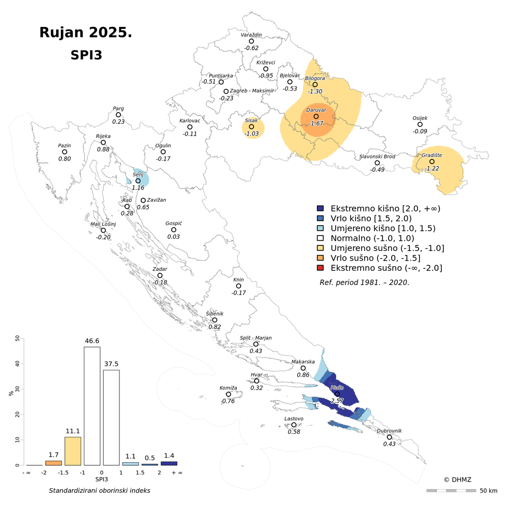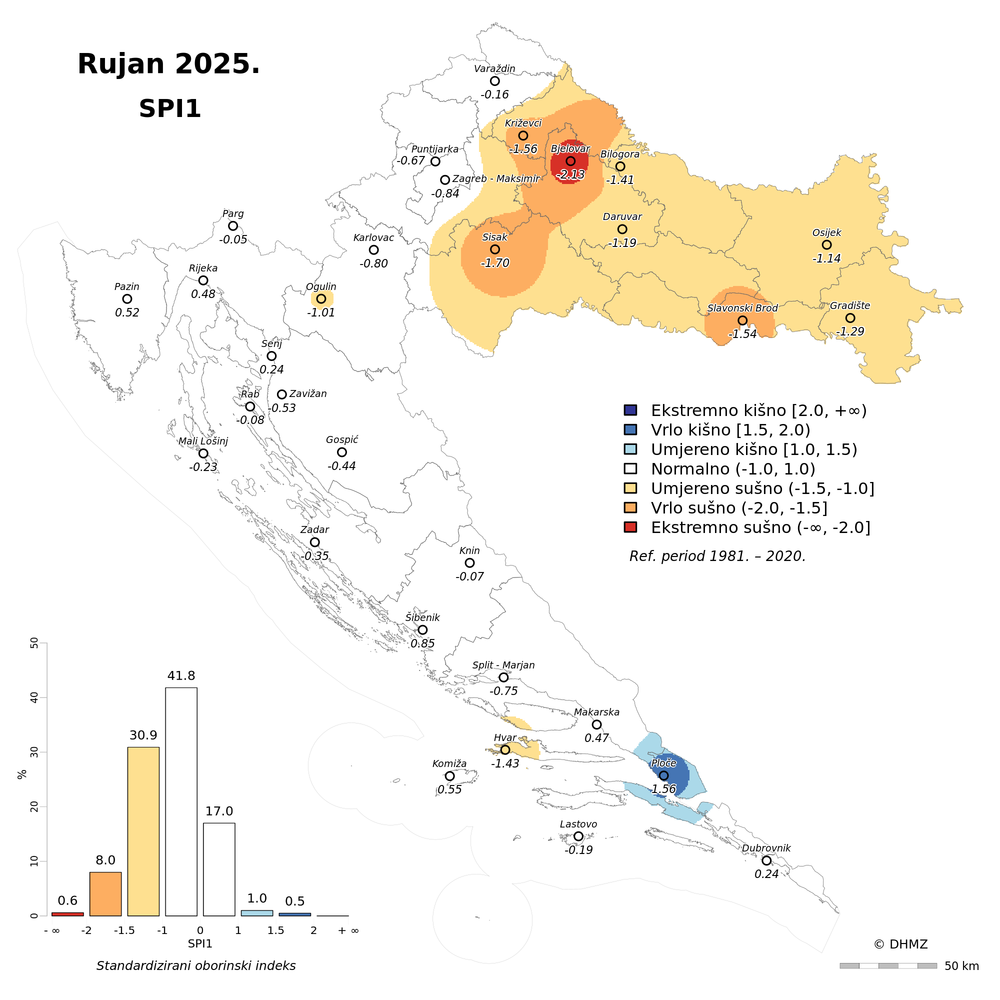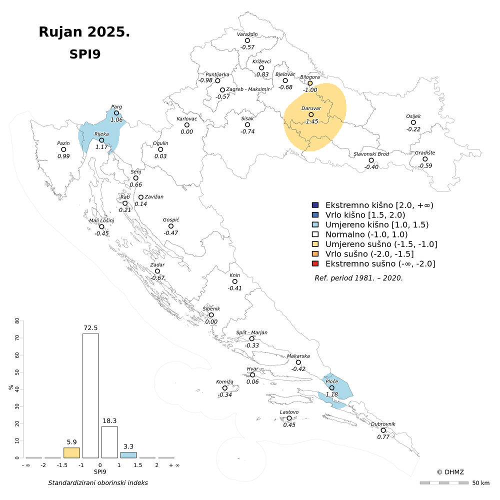 U proteklih dva (kolovoz i rujan), tri (od srpnja do rujna) i šest mjeseci (od travnja do rujna) oborinske prilike bile su slične kao u rujnu, a najveća odstupanja od prosjeka na spomenutim skalama zabilježena su redom u Sisku (ekstremno sušno), u Pločama (ekstremno kišno) i u Daruvaru (ekstremno sušno).