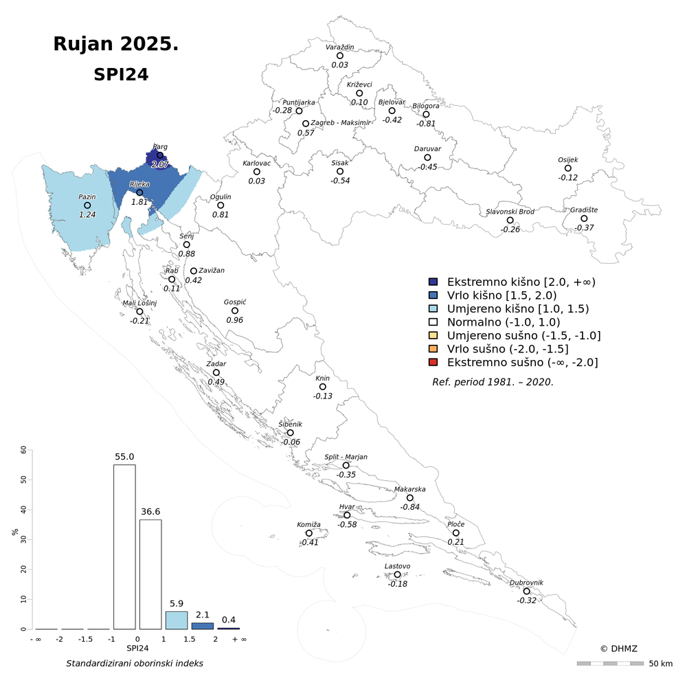 Normalne oborinske prilike prevladale su u gotovo cijeloj Hrvatskoj na preostalim analiziranim skalama do unatrag dvije godine, tj. na skalama od devet, 12, 18 i 24 mjeseca. Najveće odstupanje količine oborine od prosjeka zabilježeno je na skali od 24 mjeseca na području Parga i Rijeke, gdje je bilo ekstremno kišno i vrlo kišno.