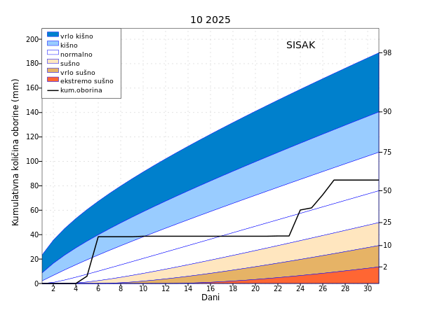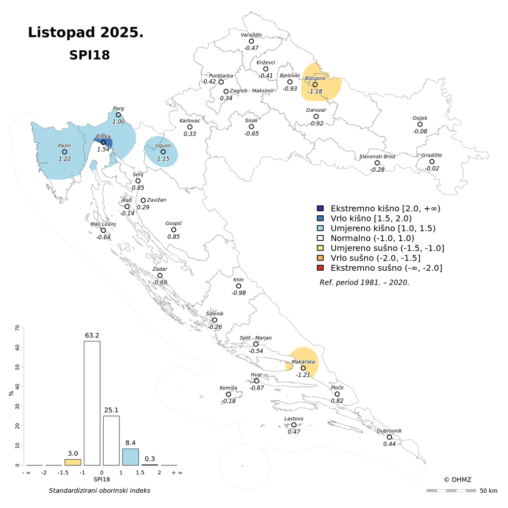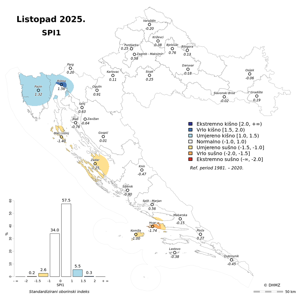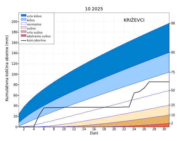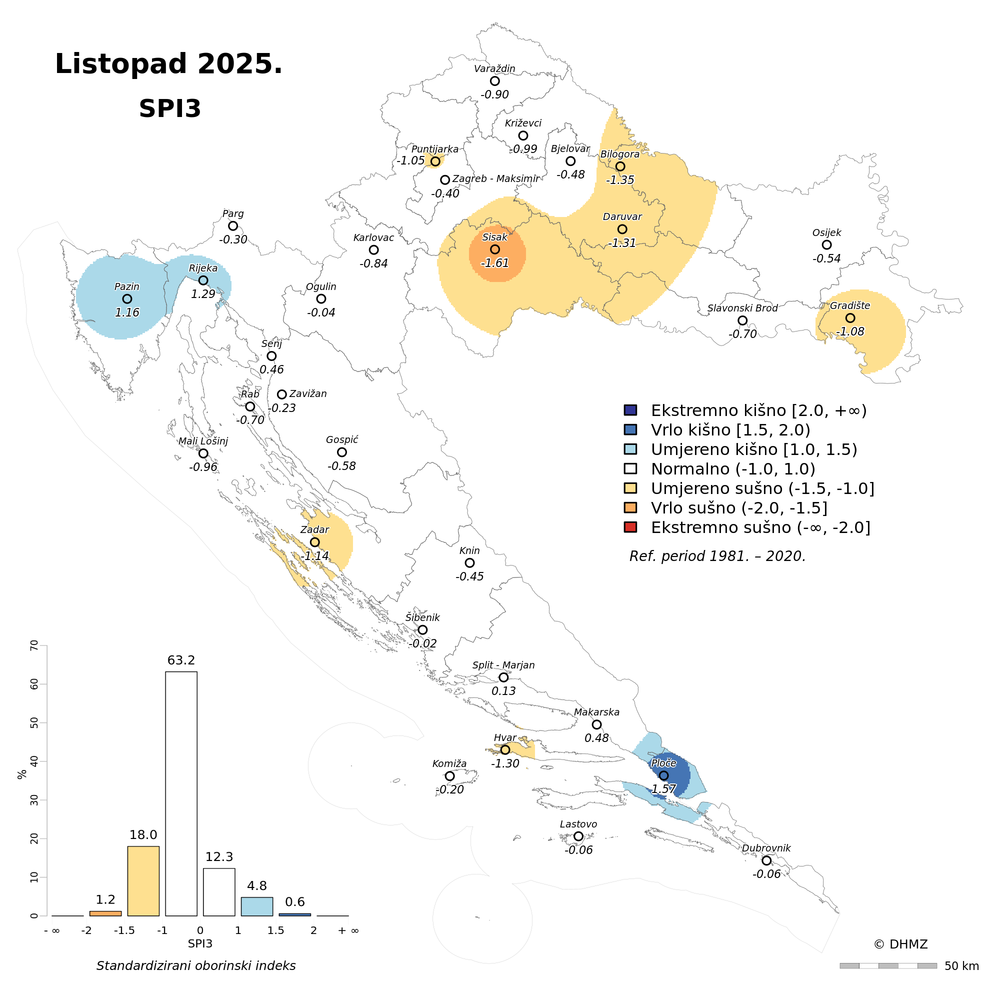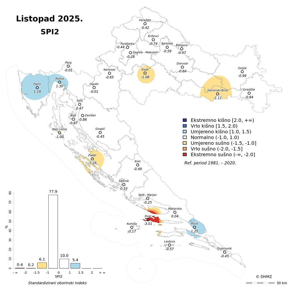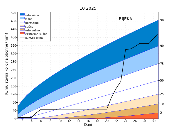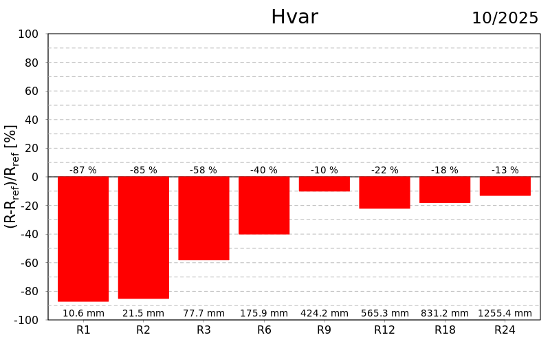 U protekla dva (rujan i listopad) mjeseca oborinske prilike bile su slične kao i u listopadu uz veće odstupanje od prosjeka na postaji Hvar (ekstremno sušno). Unazad tri (od kolovoza do listopada) i šest (od svibnja do listopada) mjeseci najveća odstupanja bila su na području Bilogore i Daruvara (ekstremno sušno) te kod Ploča (ekstremno kišno).