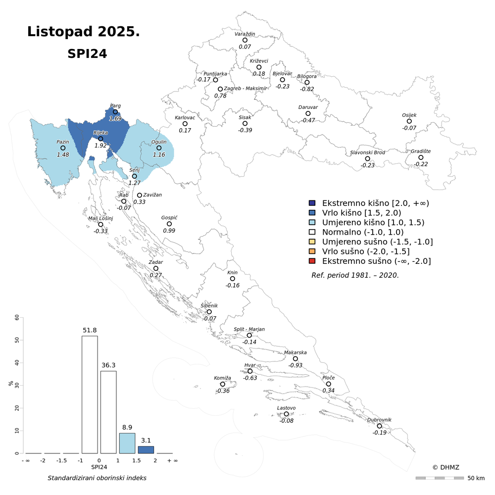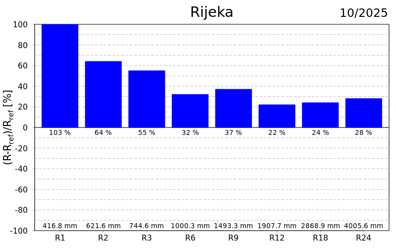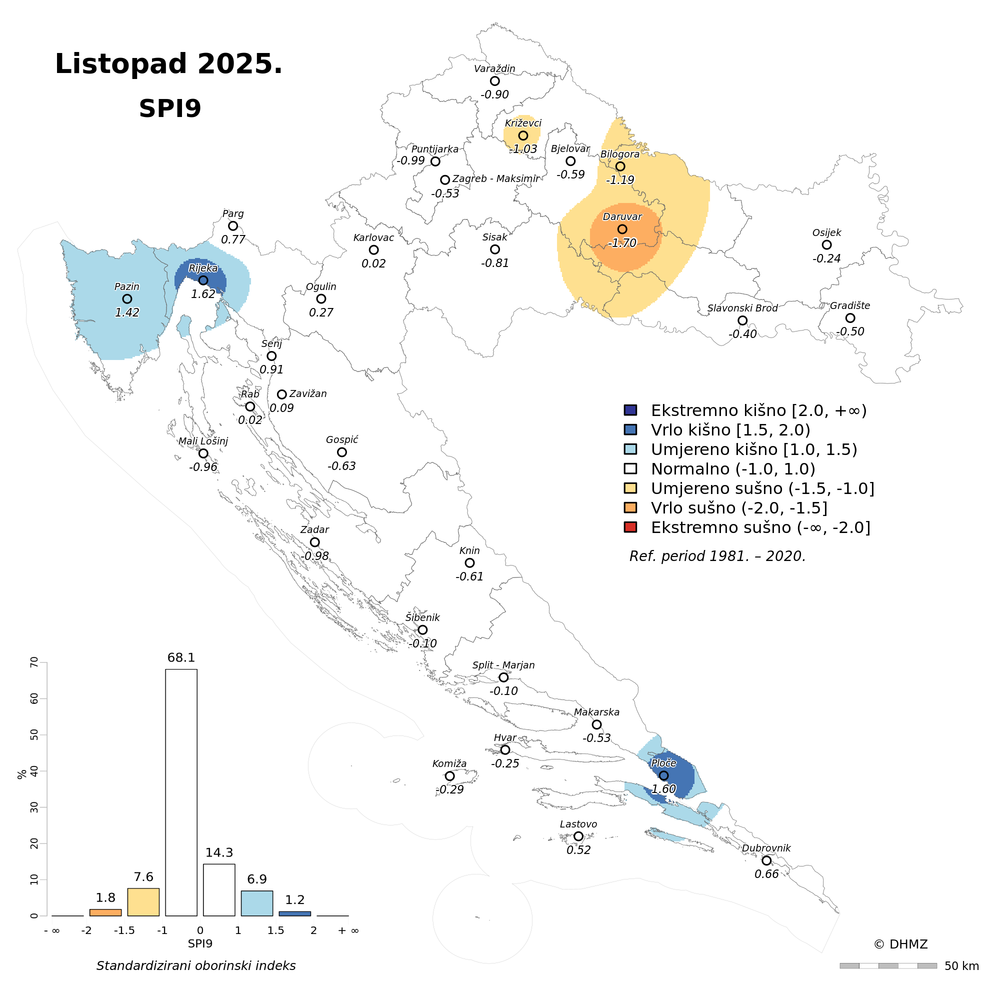 Normalne oborinske prilike prevladavale su u većini Hrvatske u proteklih devet, 12, 18 i 24 mjeseca. S konzistentnim odstupanjem oborine od prosjeka izuzetak su područje Rijeke, koje je uglavnom vrlo kišno s najvećim pozitivnim odstupanjem na ovim vremenskim skalama, i područje Istre, koje je pretežito umjereno kišno.