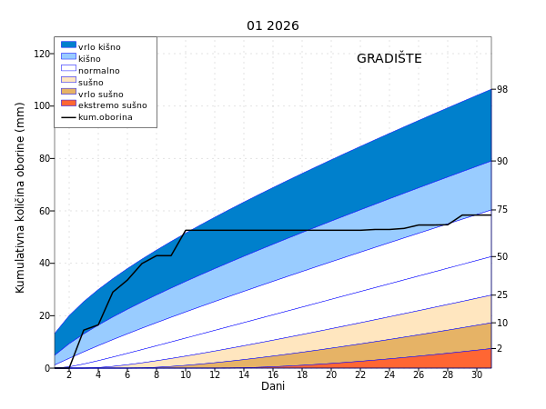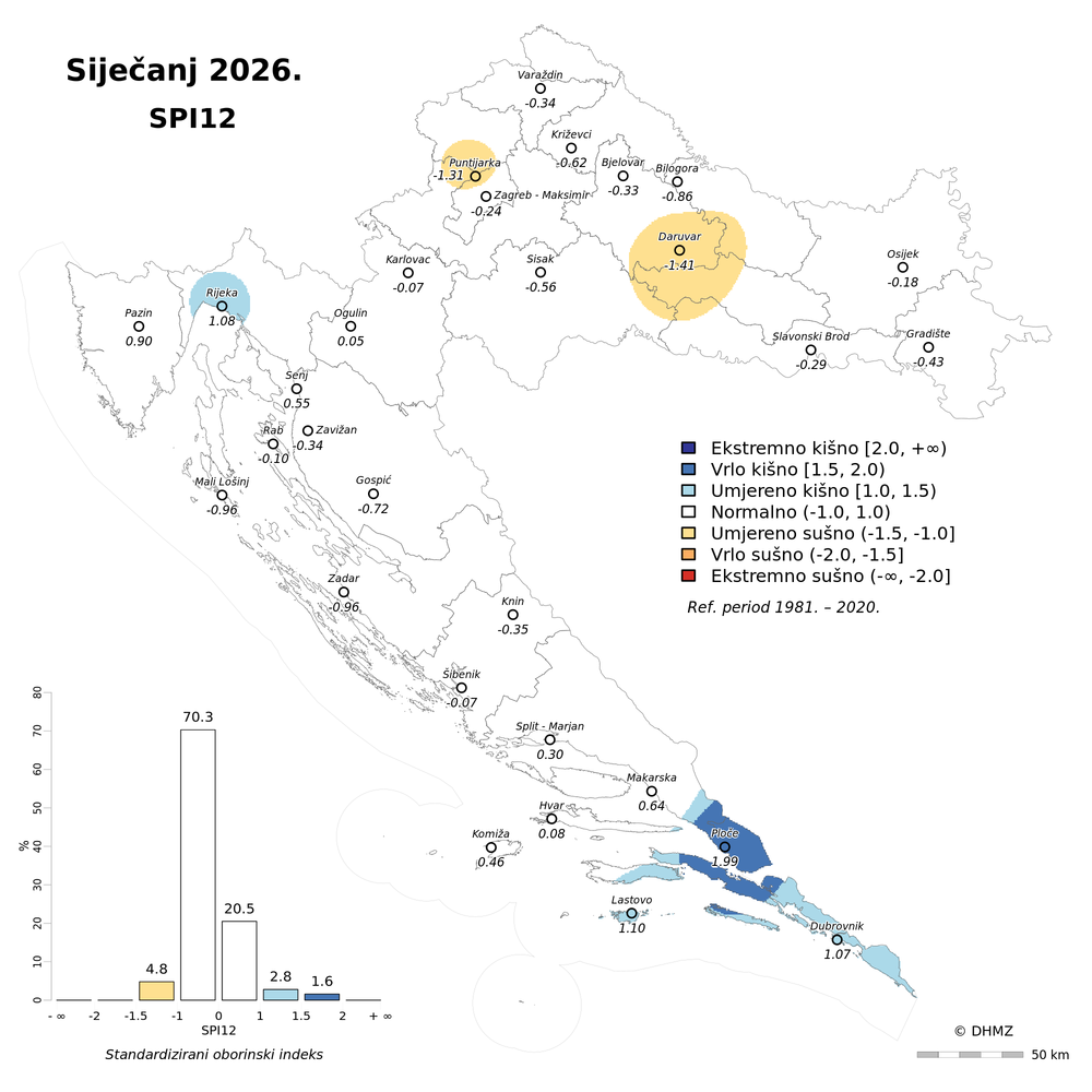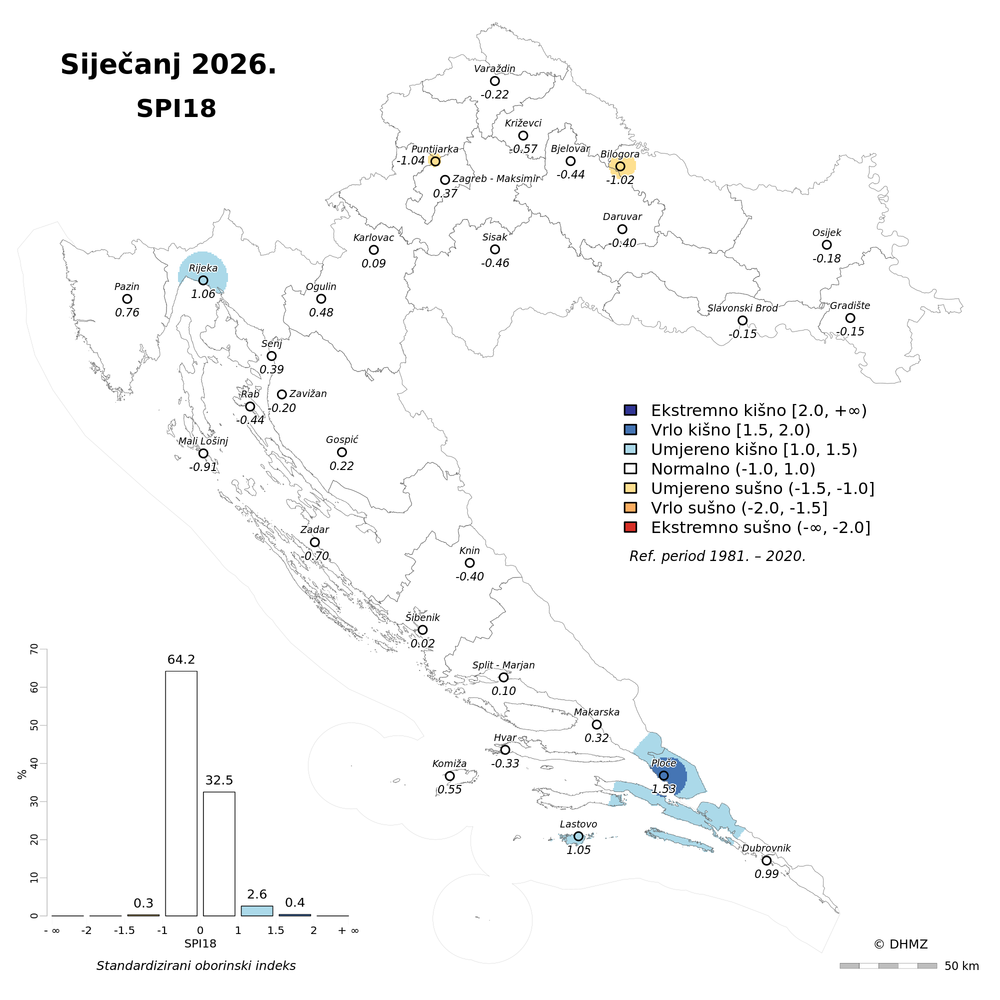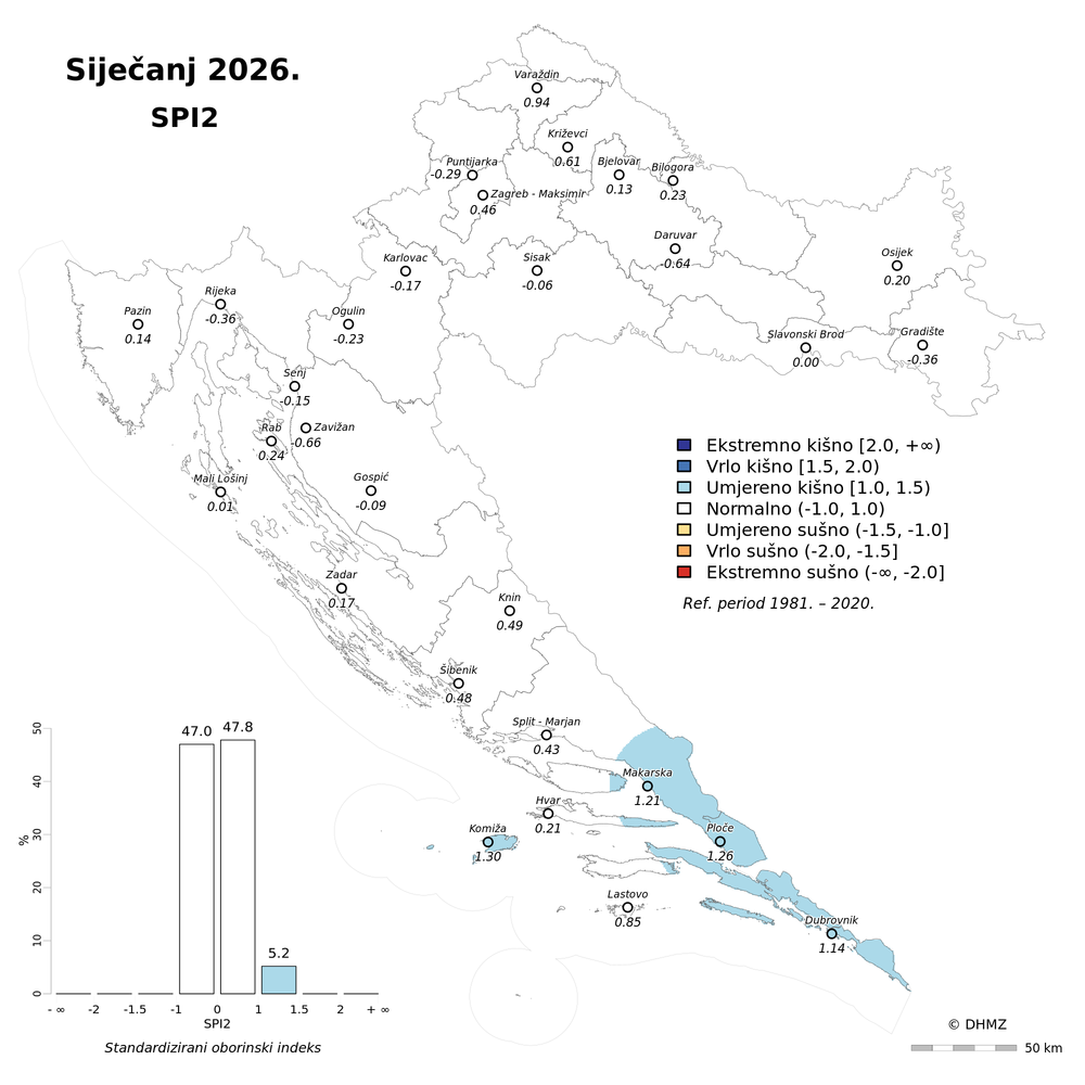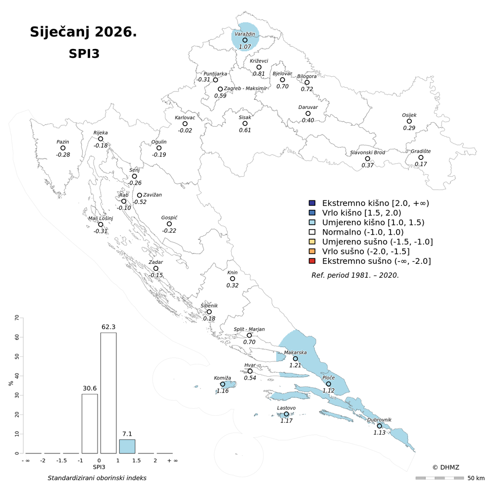 U siječnju su prevladavale normalne oborinske prilike pretežito na području gorske i nizinske Hrvatske. Od Ploča i Dubrovnika do područja oko Knina oborinske prilike su bile u rasponu od ekstremno do umjereno kišno, kod Pazina i u Istri vrlo i umjereno kišno, a na krajnjem sjeveru Hrvatske (Križevci, Varaždin) i sjeveroistoku Slavonije (Osijek) te u Baranji oborinske prilike su bile umjereno kišne.