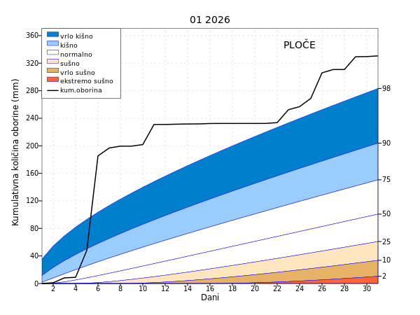 Pale su rekordne količine mjesečne i dnevne oborine na postajama Makarska i Ploče, te je tako najveće pozitivno odstupanje mjesečne količine oborine od višegodišnjeg siječanjskog prosjeka zabilježeno na postaji Makarska (199 %) gdje je palo 282.4 mm kiše, a od toga je 126.0 mm palo u jednom danu. Najveća mjesečna količina oborine zabilježena je na postaji Ploče s 330.6 mm kiše (196 %), a 137.3 mm je palo u jednom danu. Najdulje kišno razdoblje zabilježeno je na postaji Knin s trajanjem od devet dana. Najdulje sušno razdoblje zabilježeno je u istom periodu na postajama Gradište i Slavonski Brod i trajalo je 15 dana.