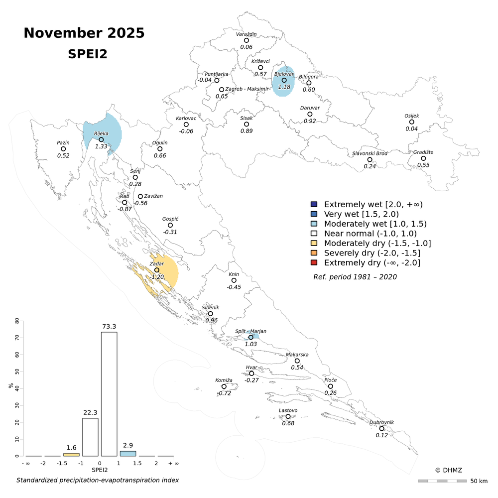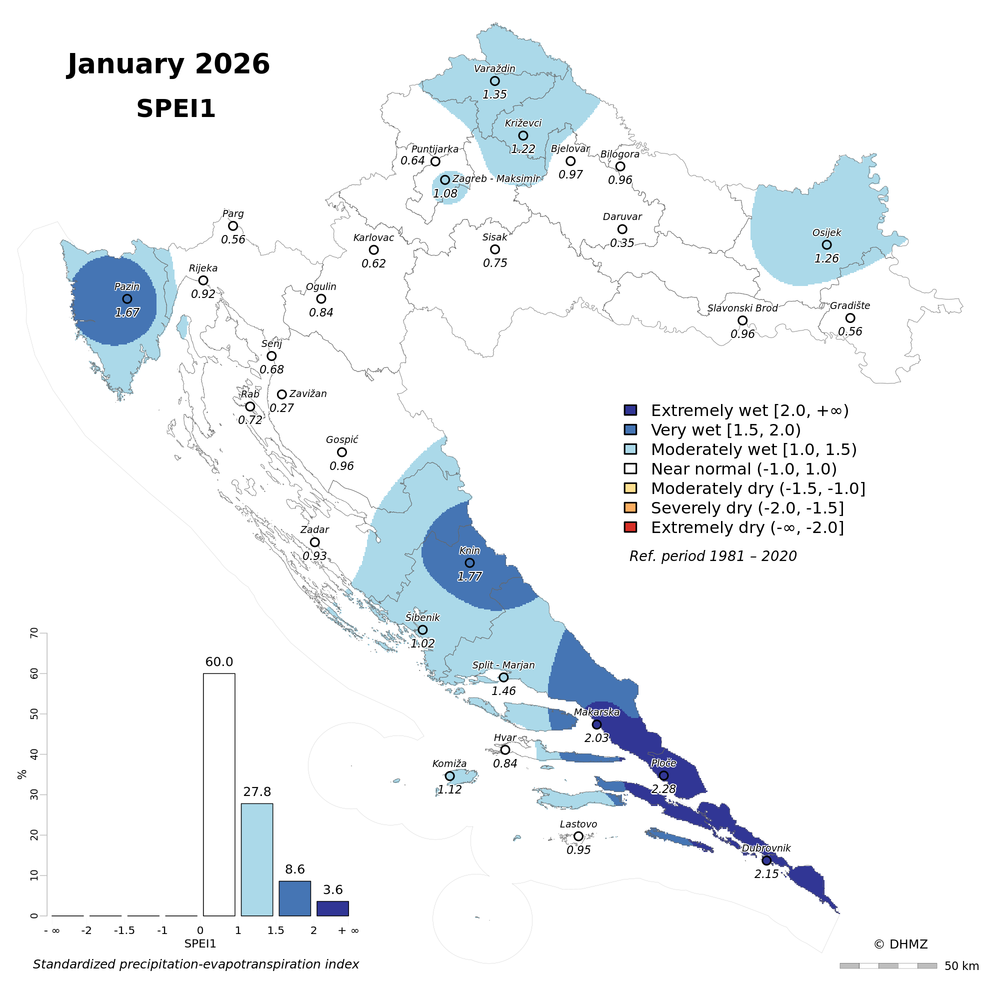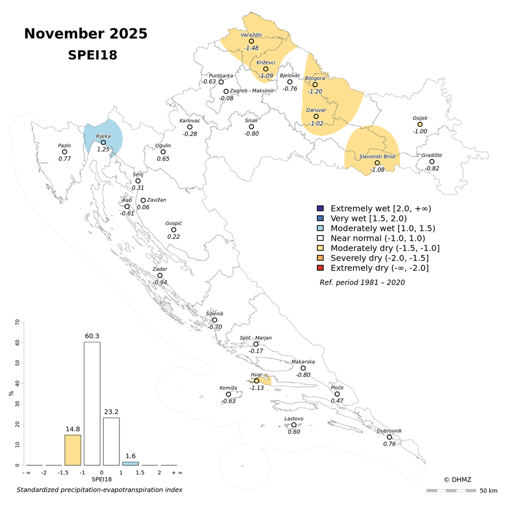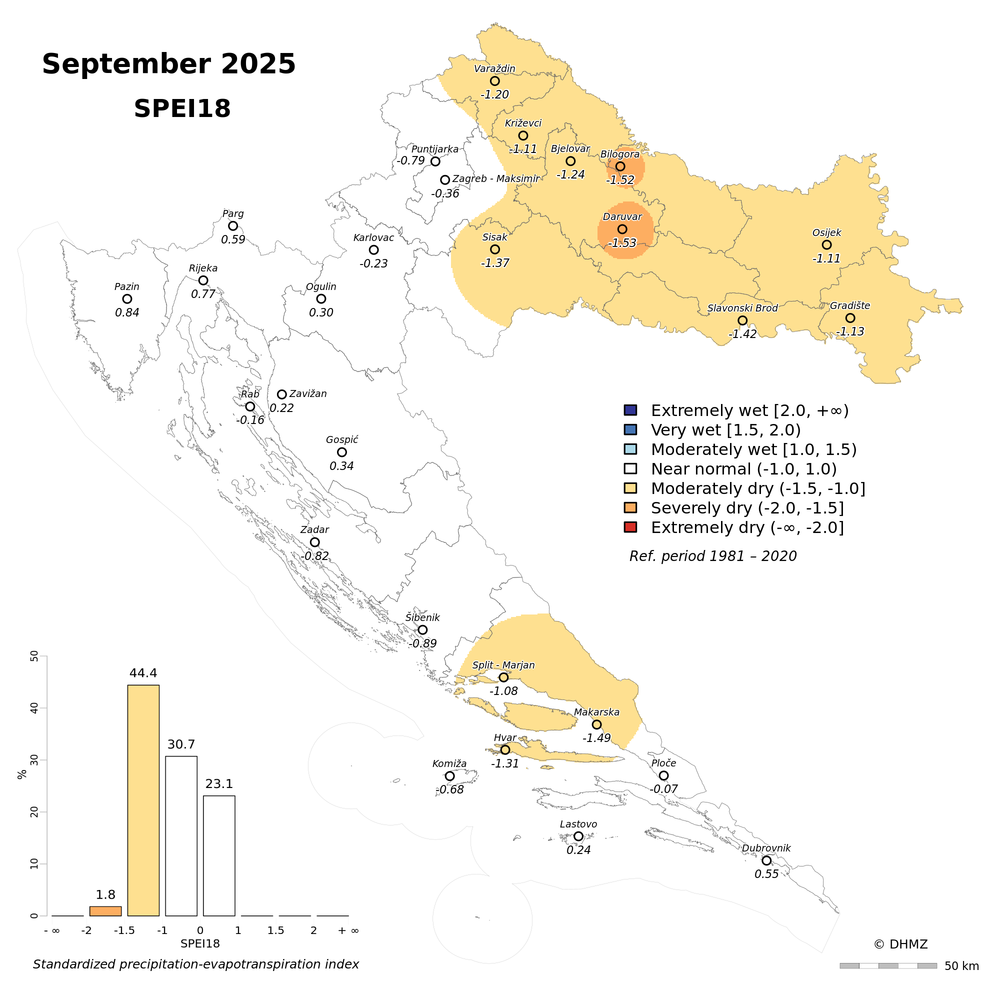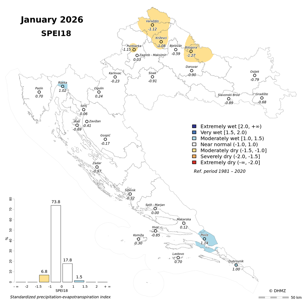 The standardized precipitation-evapotranspiration index (SPEI; Vicente-Serrano et al. 2010) was calculated for 30 main meteorological stations in Croatia at different time-scales: 1, 2, 3, 6, 9, 12, 18 and 24 months using monthly precipitation sums, mean maximum and minimum air temperature from the period 1981 - 2020.