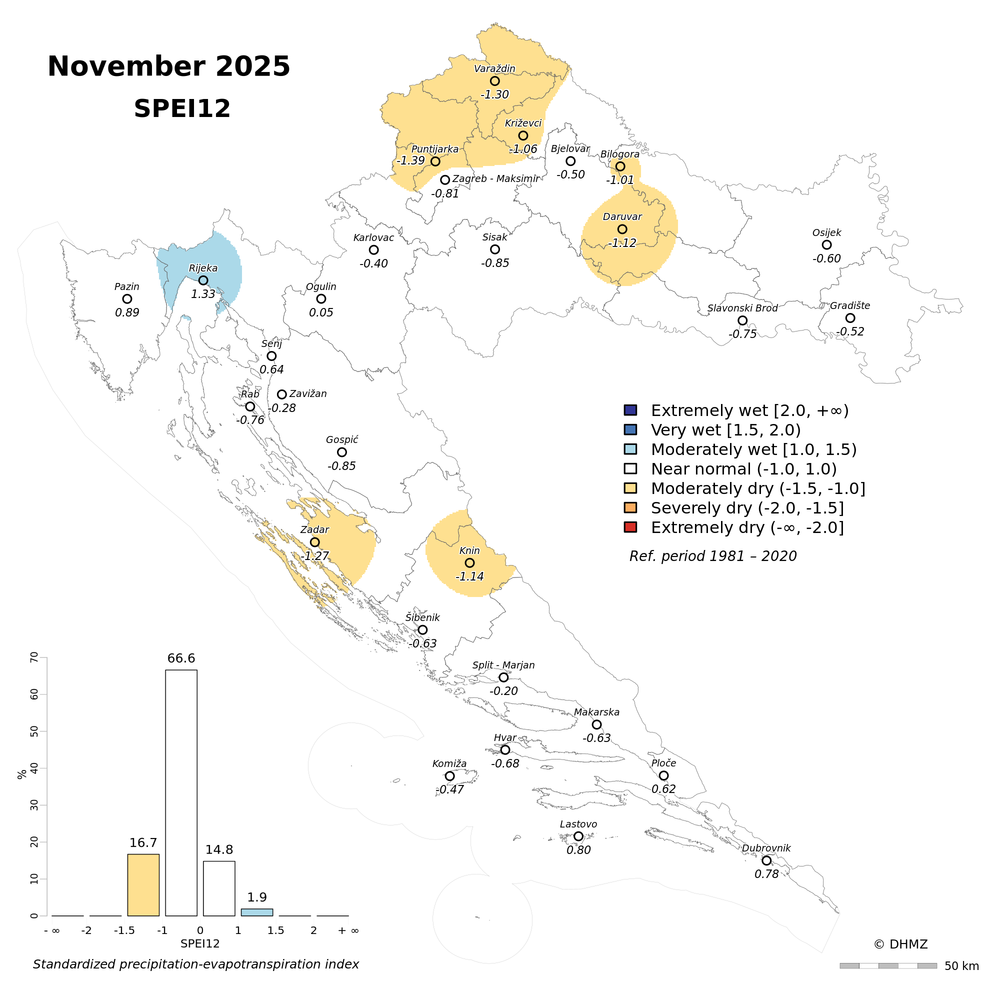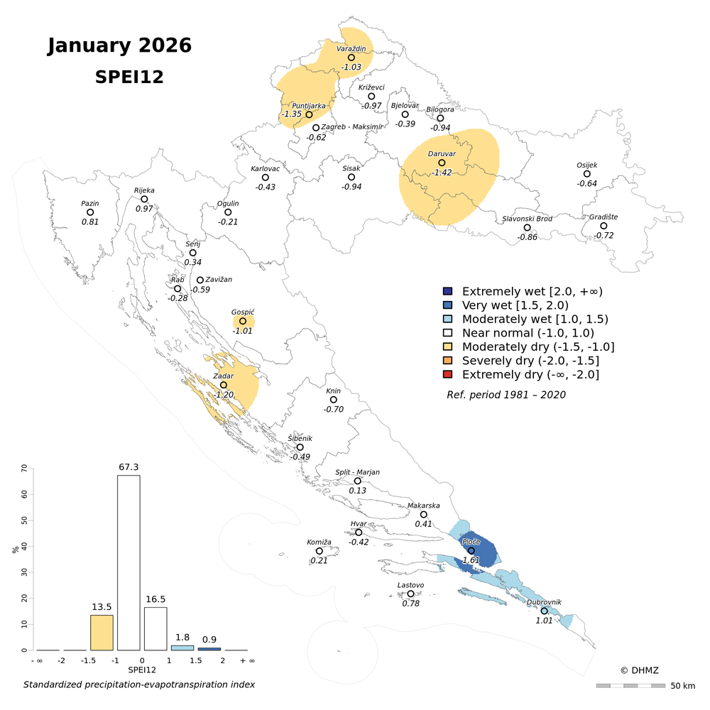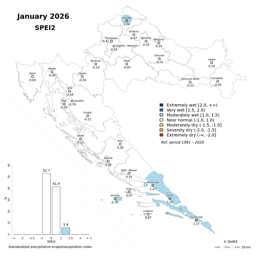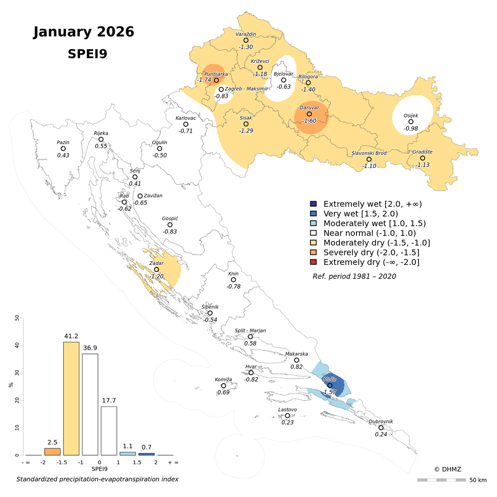 The standardized precipitation-evapotranspiration index (SPEI; Vicente-Serrano et al. 2010) was calculated for 30 main meteorological stations in Croatia at different time-scales: 1, 2, 3, 6, 9, 12, 18 and 24 months using monthly precipitation sums, mean maximum and minimum air temperature from the period 1981 - 2020.