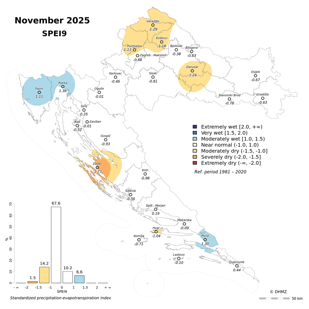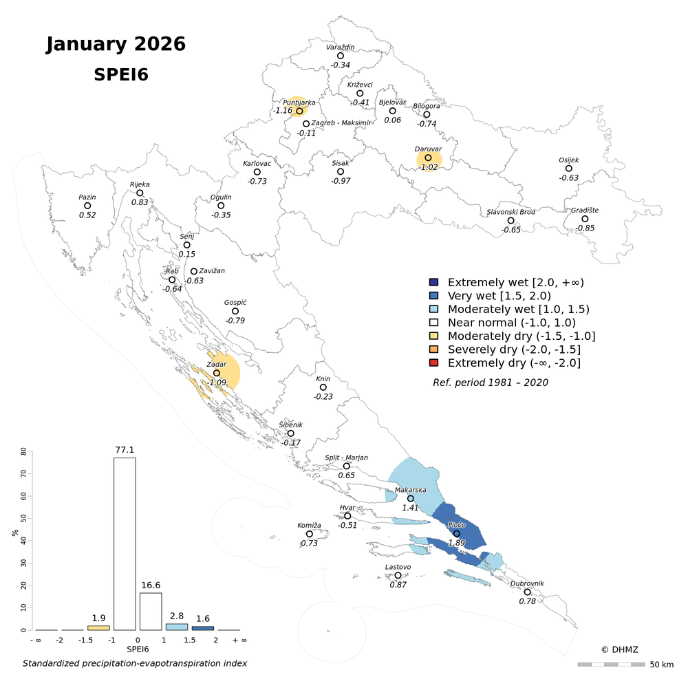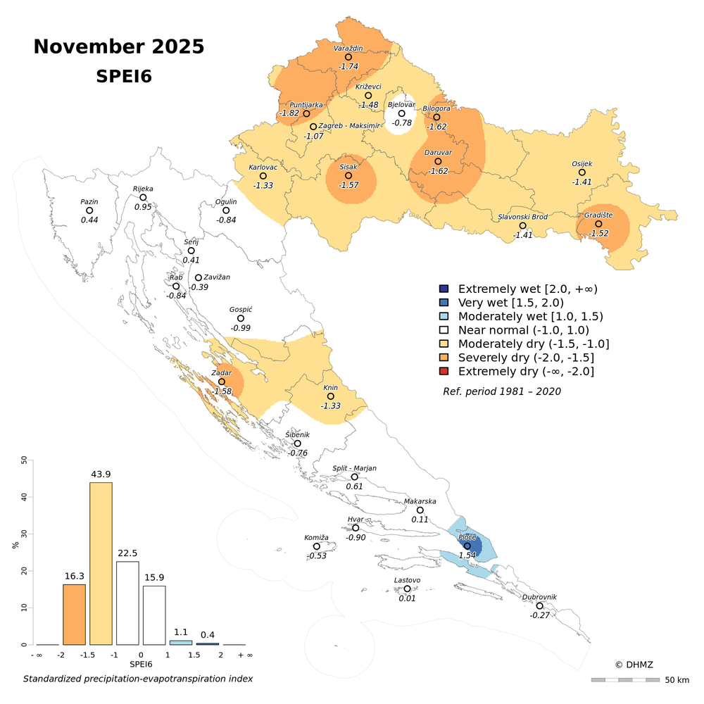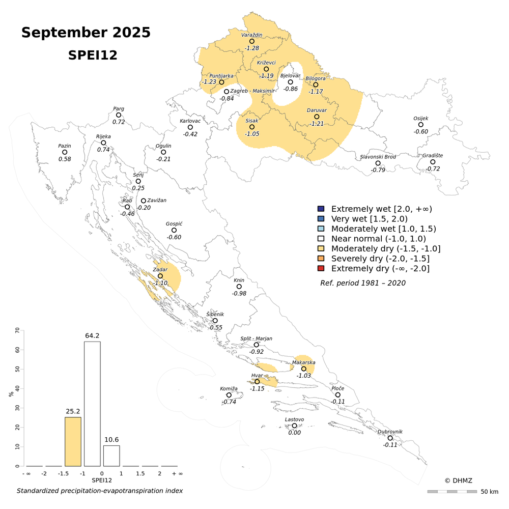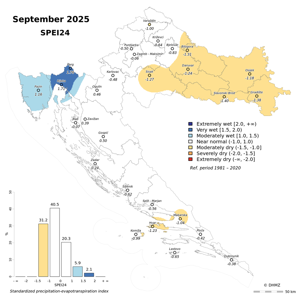 The standardized precipitation-evapotranspiration index (SPEI; Vicente-Serrano et al. 2010) was calculated for 30 main meteorological stations in Croatia at different time-scales: 1, 2, 3, 6, 9, 12, 18 and 24 months using monthly precipitation sums, mean maximum and minimum air temperature from the period 1981 - 2020.