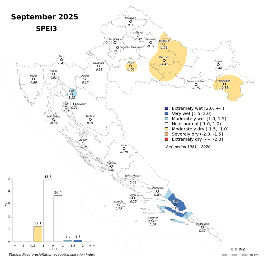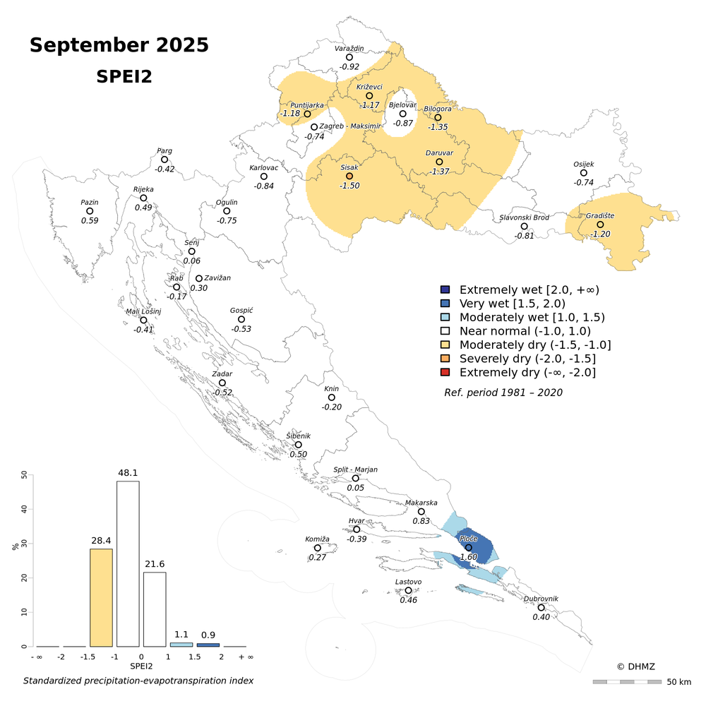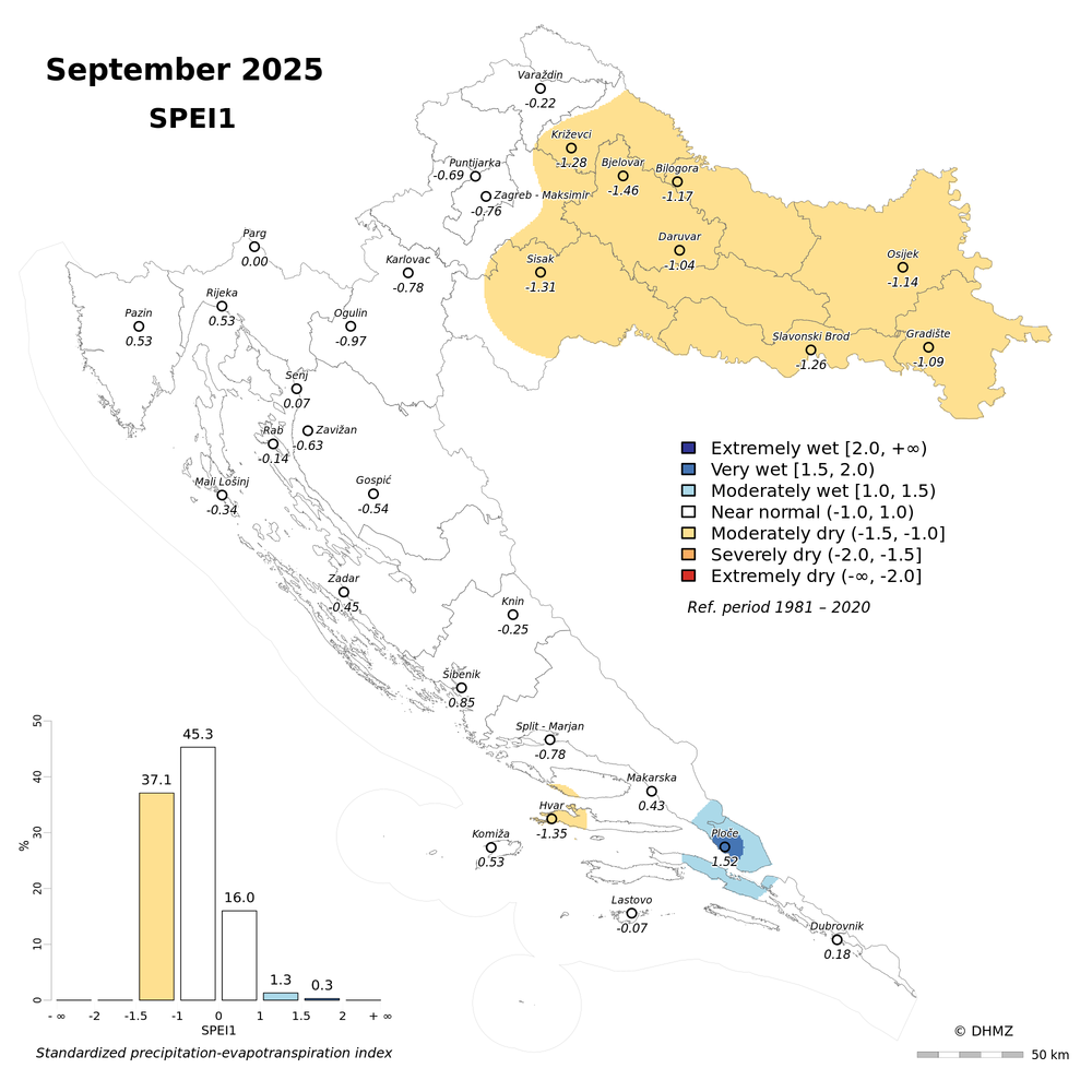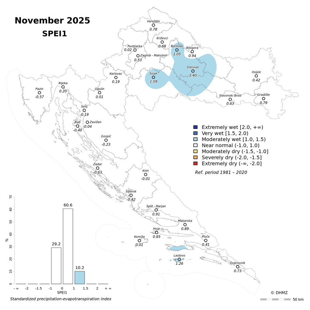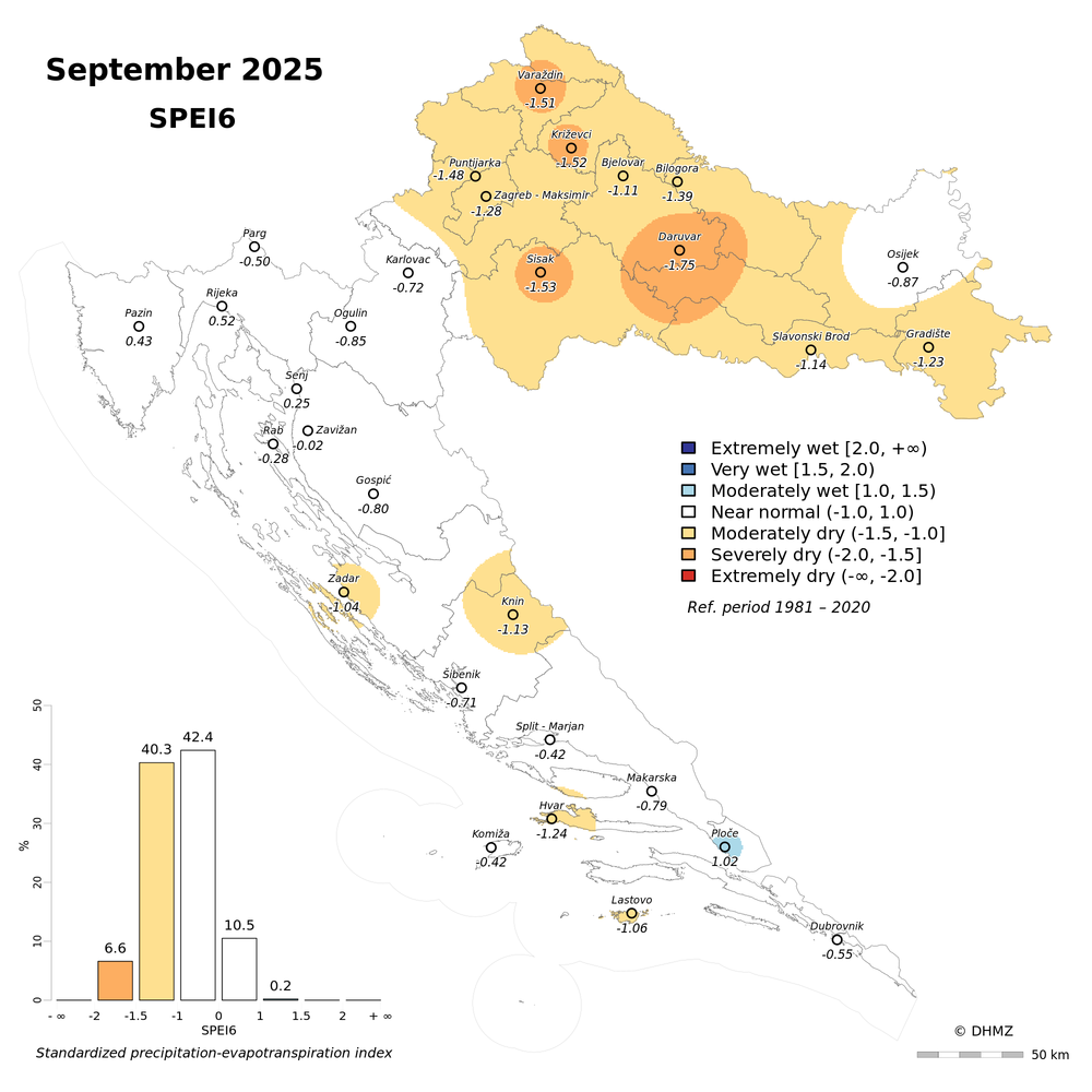 The standardized precipitation-evapotranspiration index (SPEI; Vicente-Serrano et al. 2010) was calculated for 30 main meteorological stations in Croatia at different time-scales: 1, 2, 3, 6, 9, 12, 18 and 24 months using monthly precipitation sums, mean maximum and minimum air temperature from the period 1981 - 2020.