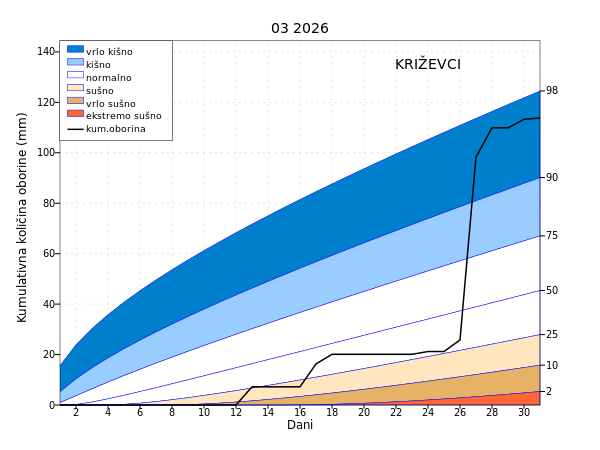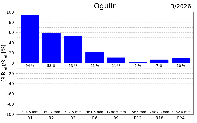 Oborinske prilike u protekla dva mjeseca bile su uglavnom normalne s umjereno kišnim uvjetima na postajama Daruvar, Bjelovar, Križevci, Zagreb – Maksimir, Ogulin, Pazin, Zadar, Mali Lošinj te vrlo kišnim na Lastovu. Unazad tri mjeseca umjereno kišni uvjeti u sjevernoj Hrvatskoj, sjevernoj Slavoniji, južnoj Dalmaciji te kod Ogulina, Zadra i na Malom Lošinju, a na Lastovu i kod Pazina vrlo kišni.