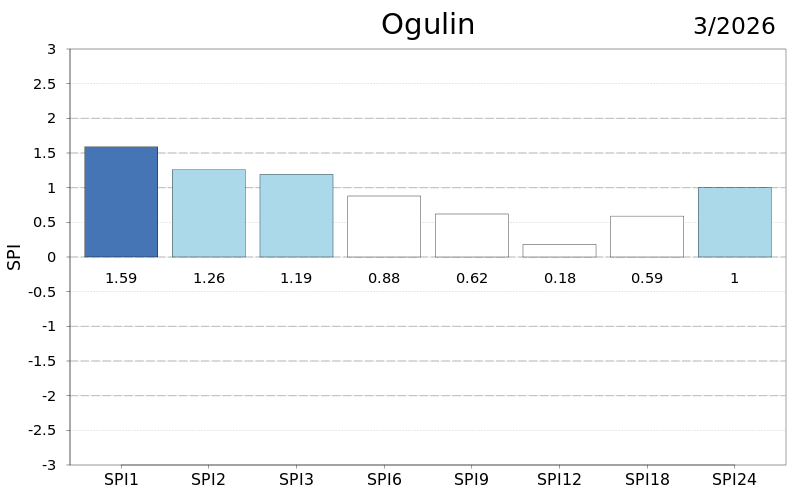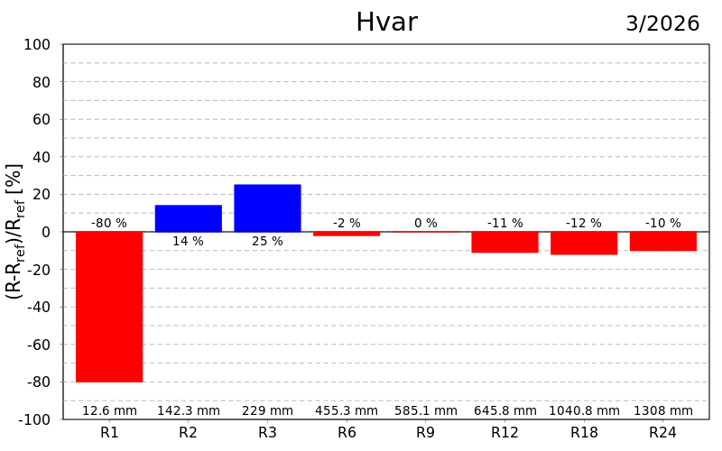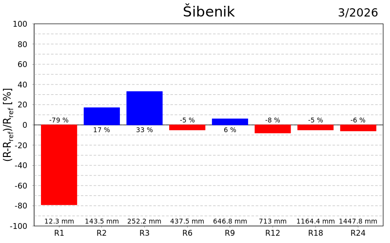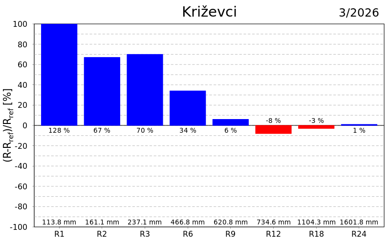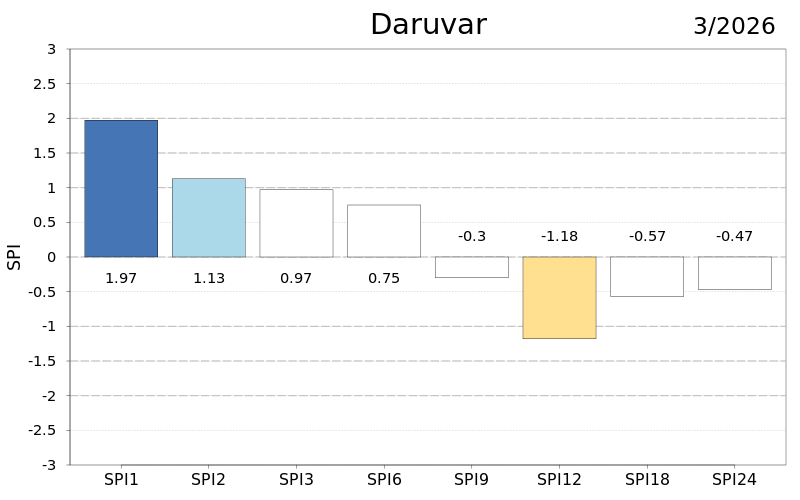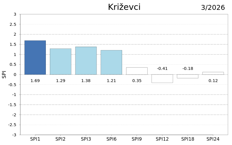 Na skali od šest mjeseci oborinske prilike su bile uglavnom normalne osim u dijelu središnje Hrvatske i Dalmacije gdje su uvjeti bili umjereno kišni, odnosno vrlo kišni na Lastovu. Devet mjeseci unazad prilike su bile normalne u većini Hrvatske osim umjereno kišnih uvjeta u Istri te u južnoj Dalmaciji gdje je bilo umjereno i vrlo kišno, dok je na godišnjoj skali bilo slično ali s umjereno sušnim uvjetima kod Daruvara i na Puntijarci. Na skalama od 18 i 24 mjeseca prevladavaju normalni uvjeti uz lokalno umjereno sušne i kišne prilike na Puntijarci, u Istri, Rijeci i na Lastovu. Sušne prilike izraženije su indeksom SPEI posebice na skalama većim od godišnje.