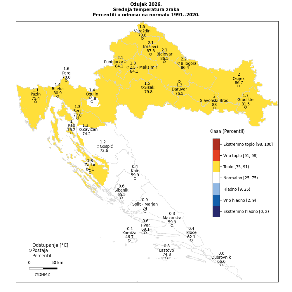 Odstupanja srednje temperature zraka u odnosu na normalu 1991. – 2020. nalaze se u rasponu od -0,1 °C (Komiža) do 2,2 °C (Bilogora).