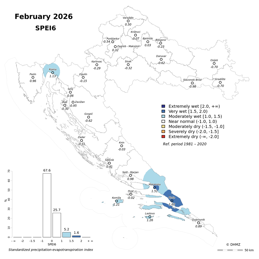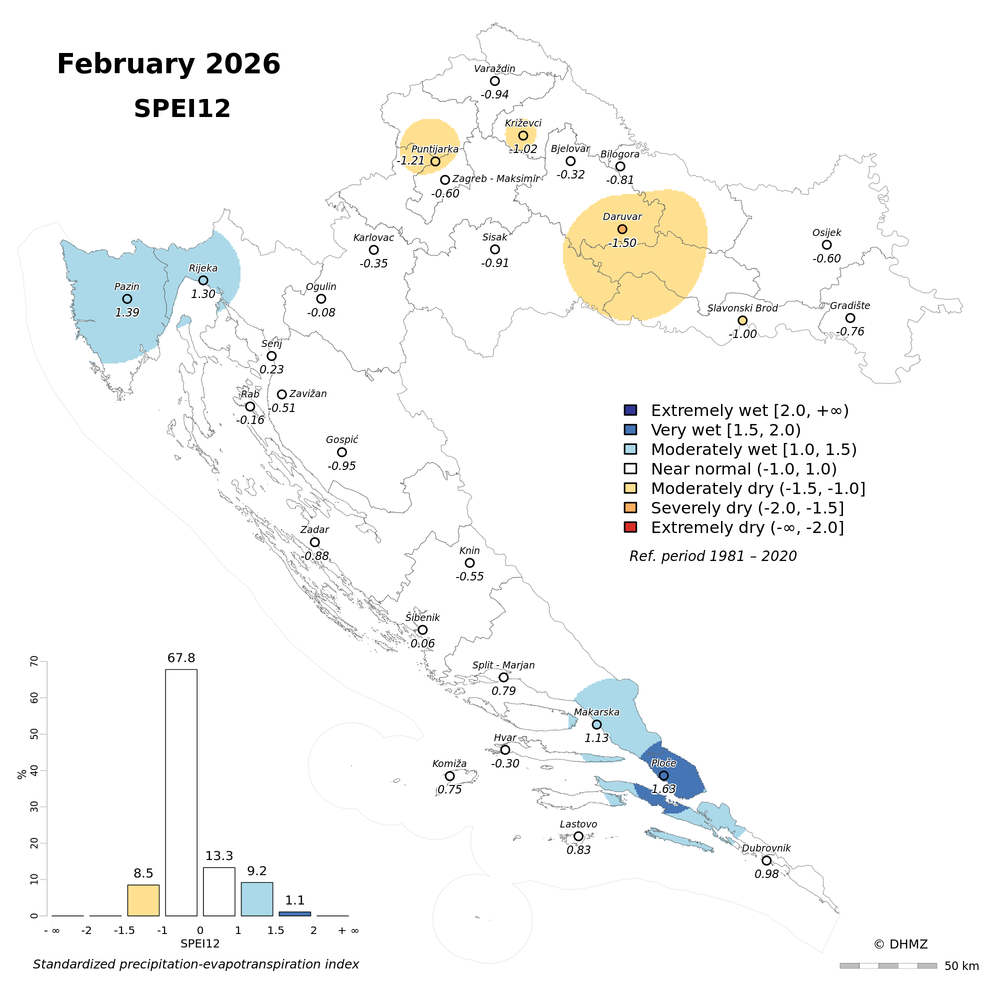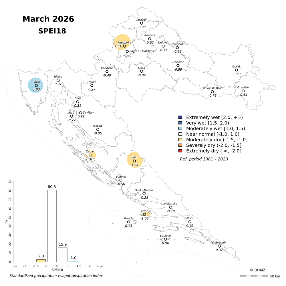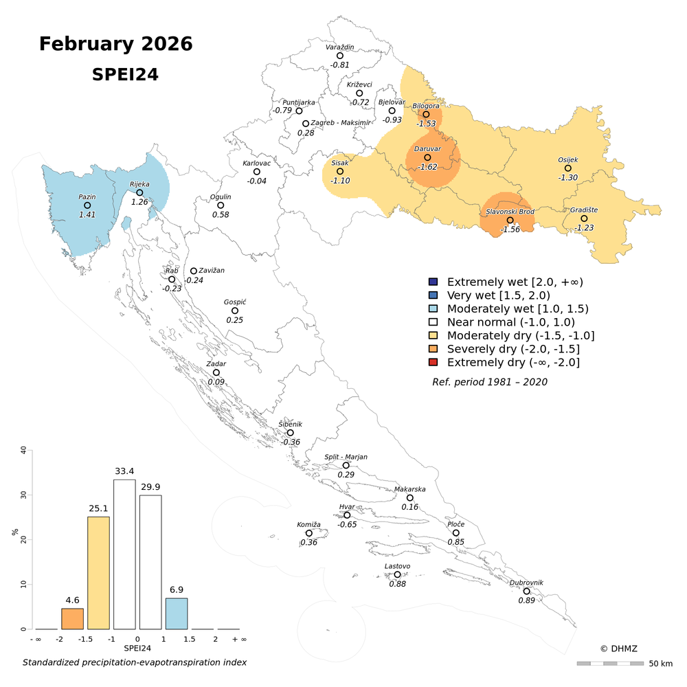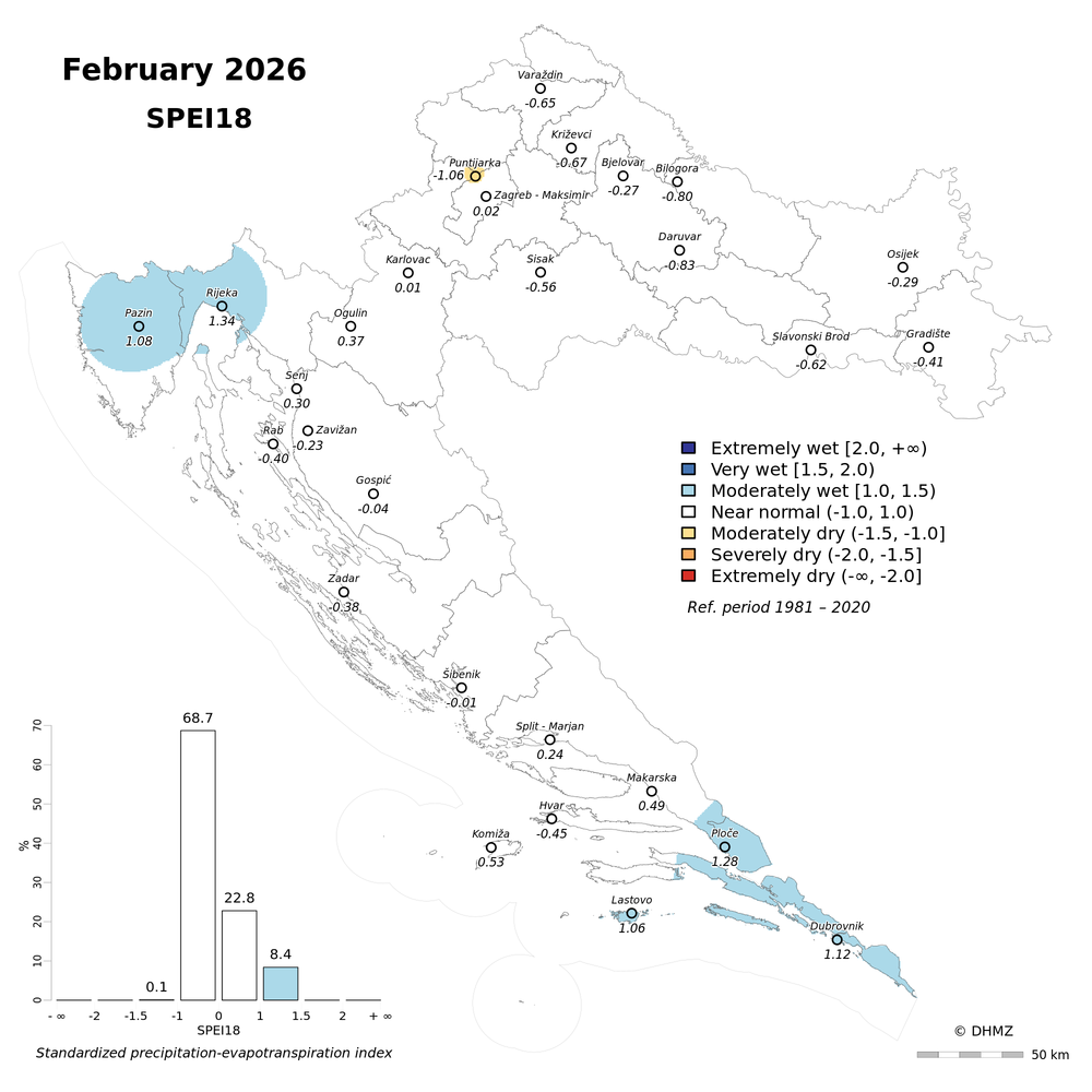 The standardized precipitation-evapotranspiration index (SPEI; Vicente-Serrano et al. 2010) was calculated for 30 main meteorological stations in Croatia at different time-scales: 1, 2, 3, 6, 9, 12, 18 and 24 months using monthly precipitation sums, mean maximum and minimum air temperature from the period 1981 - 2020.