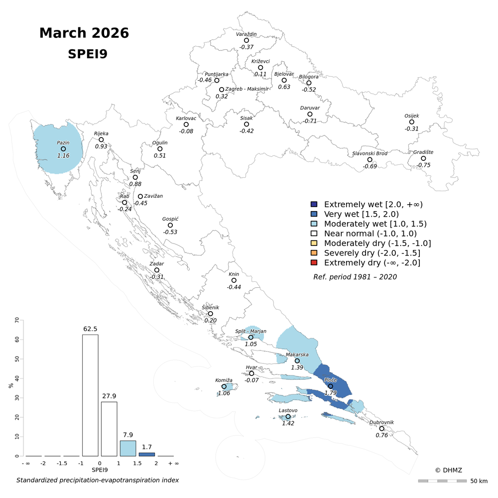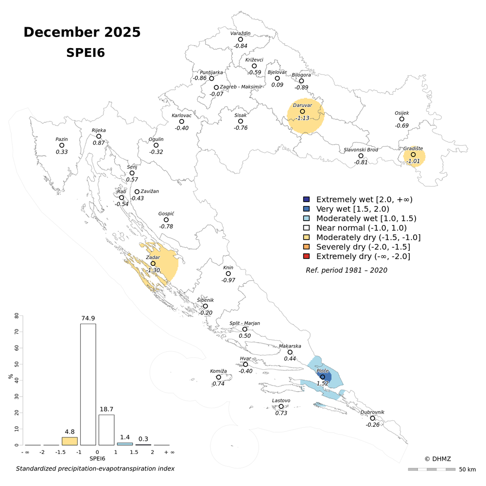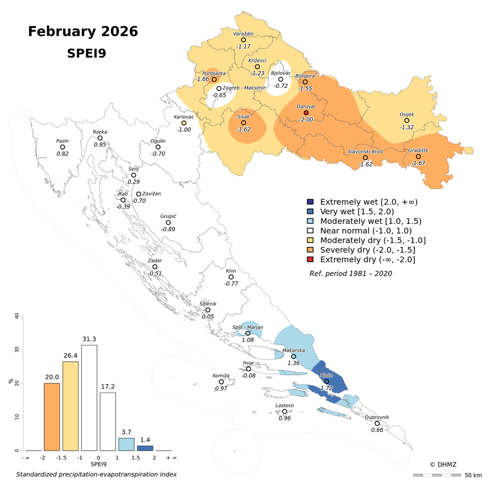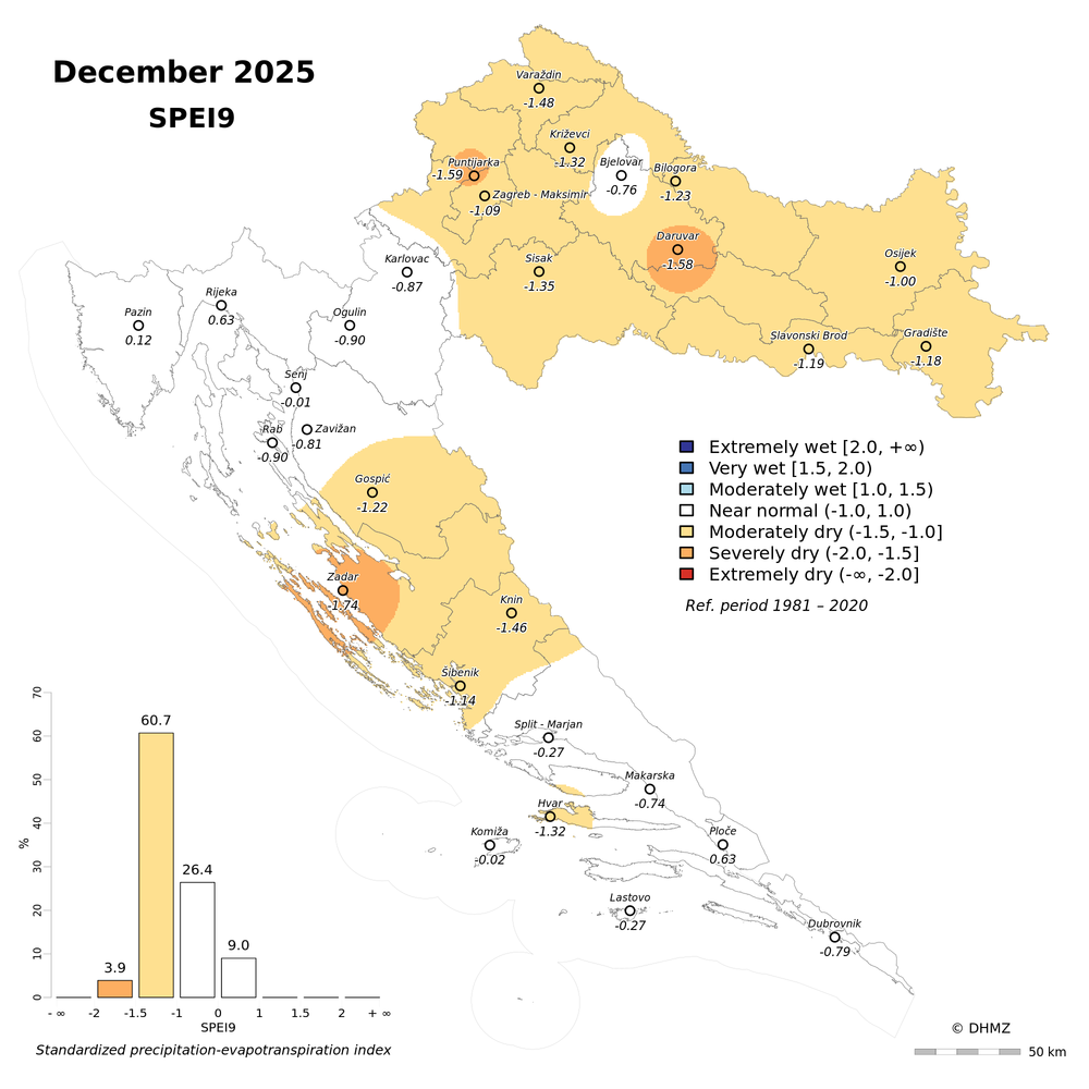 The standardized precipitation-evapotranspiration index (SPEI; Vicente-Serrano et al. 2010) was calculated for 30 main meteorological stations in Croatia at different time-scales: 1, 2, 3, 6, 9, 12, 18 and 24 months using monthly precipitation sums, mean maximum and minimum air temperature from the period 1981 - 2020.