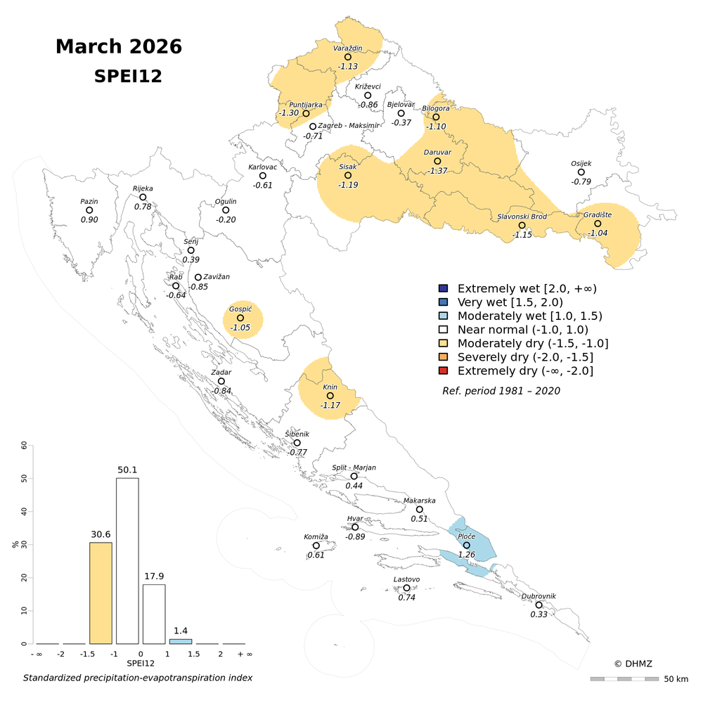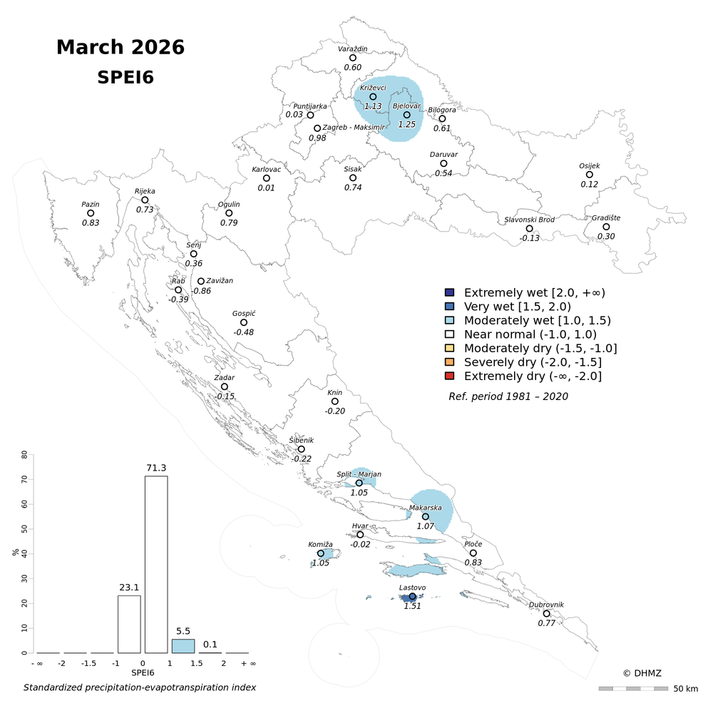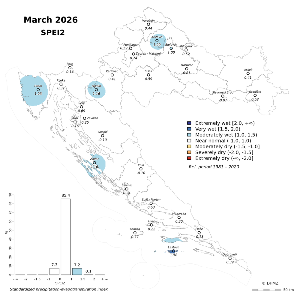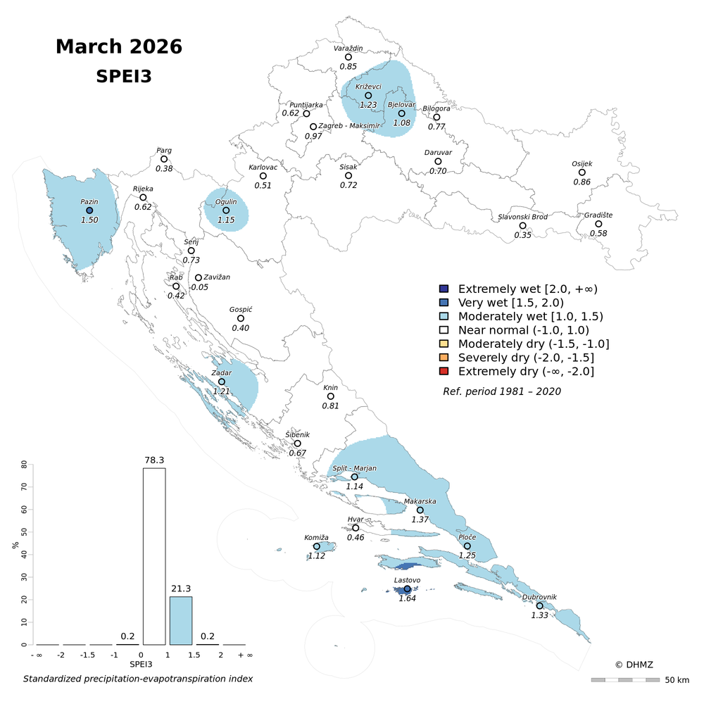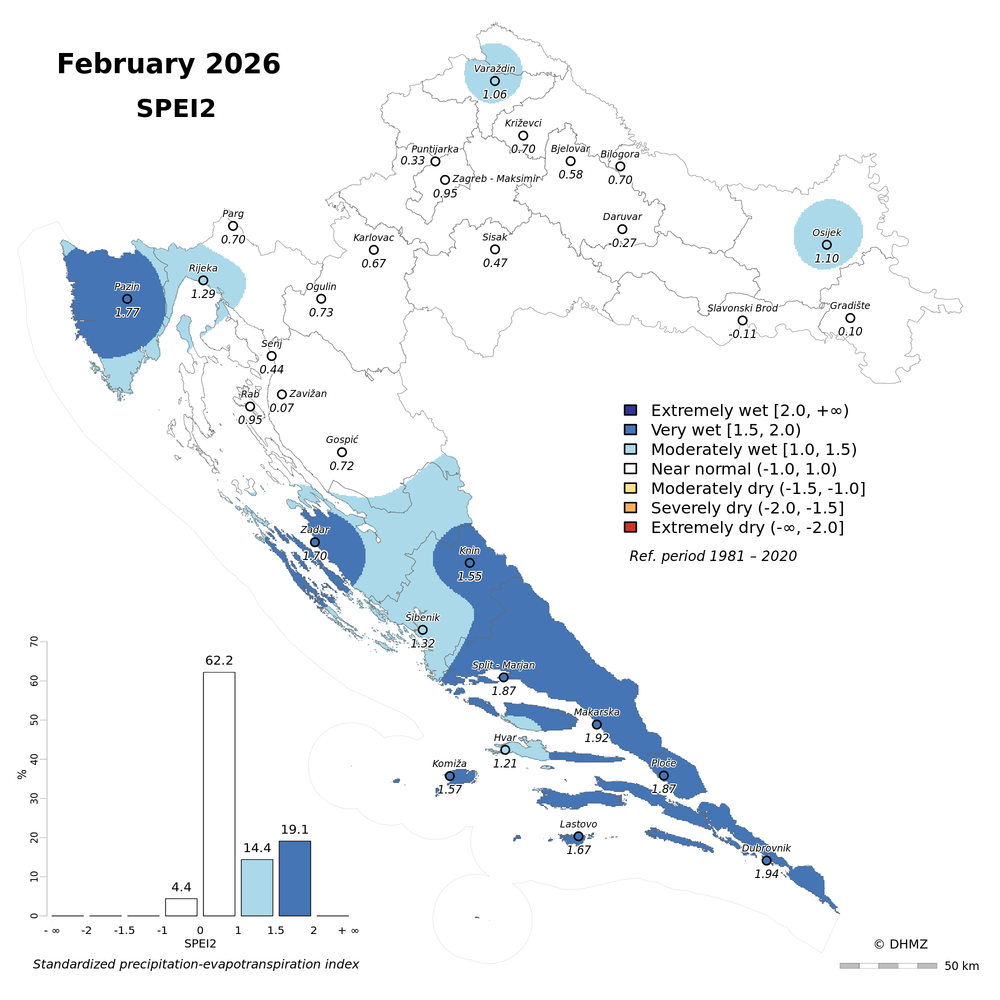 The standardized precipitation-evapotranspiration index (SPEI; Vicente-Serrano et al. 2010) was calculated for 30 main meteorological stations in Croatia at different time-scales: 1, 2, 3, 6, 9, 12, 18 and 24 months using monthly precipitation sums, mean maximum and minimum air temperature from the period 1981 - 2020.